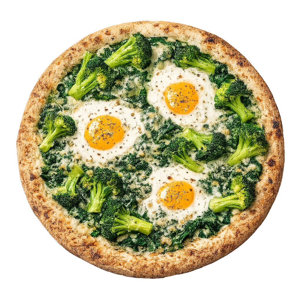 Cremige Gorgonzolasauce trifft auf knusprigen Boden, belegt mit Brokkoli und Spinat. Das Spiegelei krönt die Pizza Gemeli mit sämiger Note und feiner Würze.