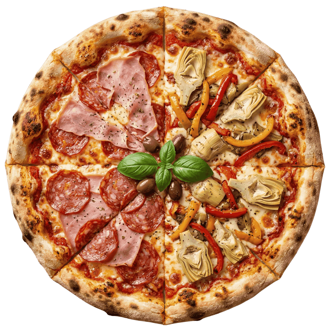 Die Quattro Stagioni vereint vier Geschmackswelten auf einem knusprigen Boden. Fruchtige Tomatensauce und fein schmelzender Käse bilden die Basis, darauf treffen saftiger Schinken und würzige Salami. Zarte Artischockenherzen und aromatische Paprika runden das Bild ab – eine harmonische Komposition, die Vielfalt und Balance auf jedem Stück bietet.