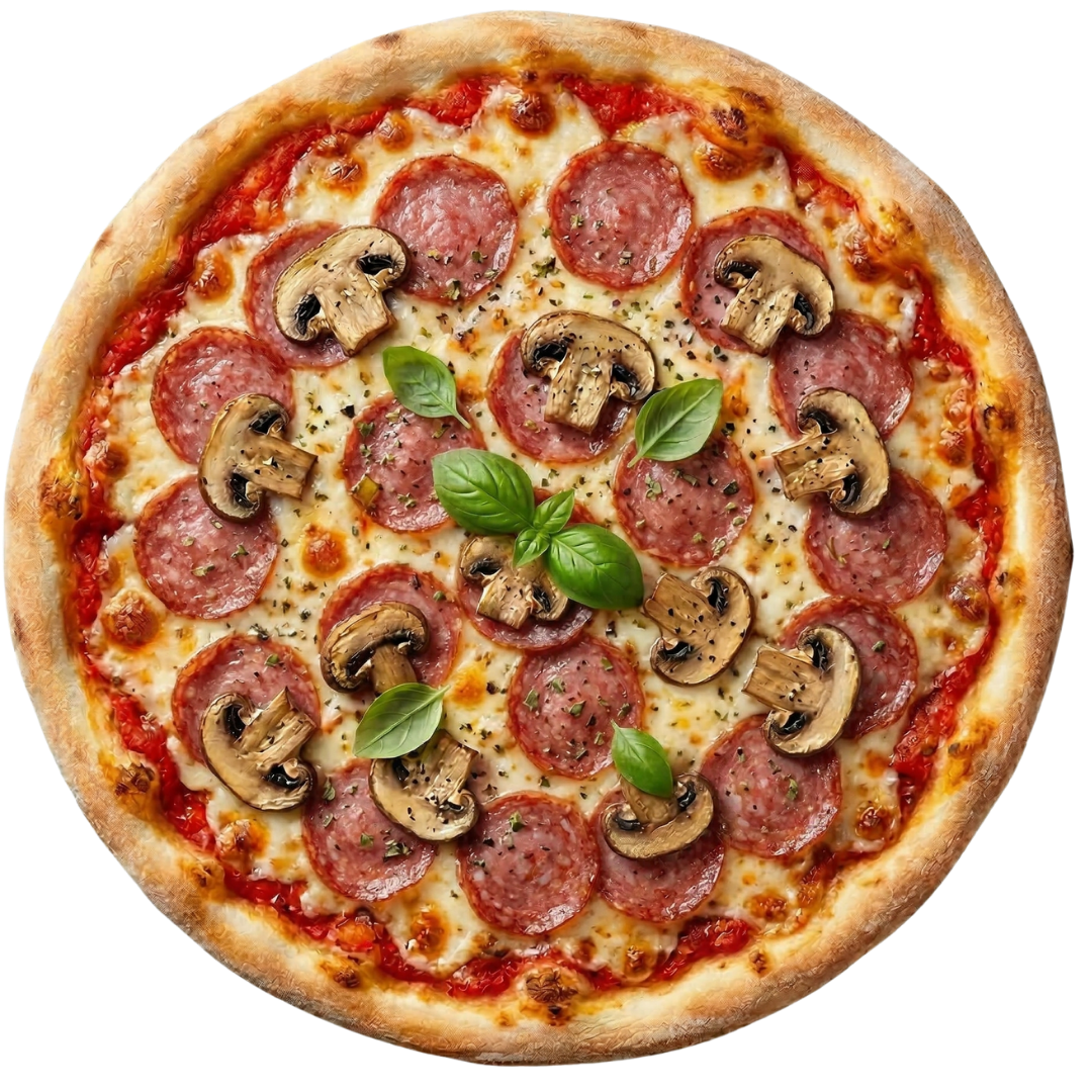 Diese Pizza verbindet eine aromatische Tomatensauce mit fein zerlaufenem Käse und einem ausgewogenen Belag aus Salami und Pilzen. Der Teig wird sorgfältig verarbeitet, damit der Rand luftig und der Boden knusprig bleibt. Ein Klassiker, der durch seine klare Rezeptur überzeugt.