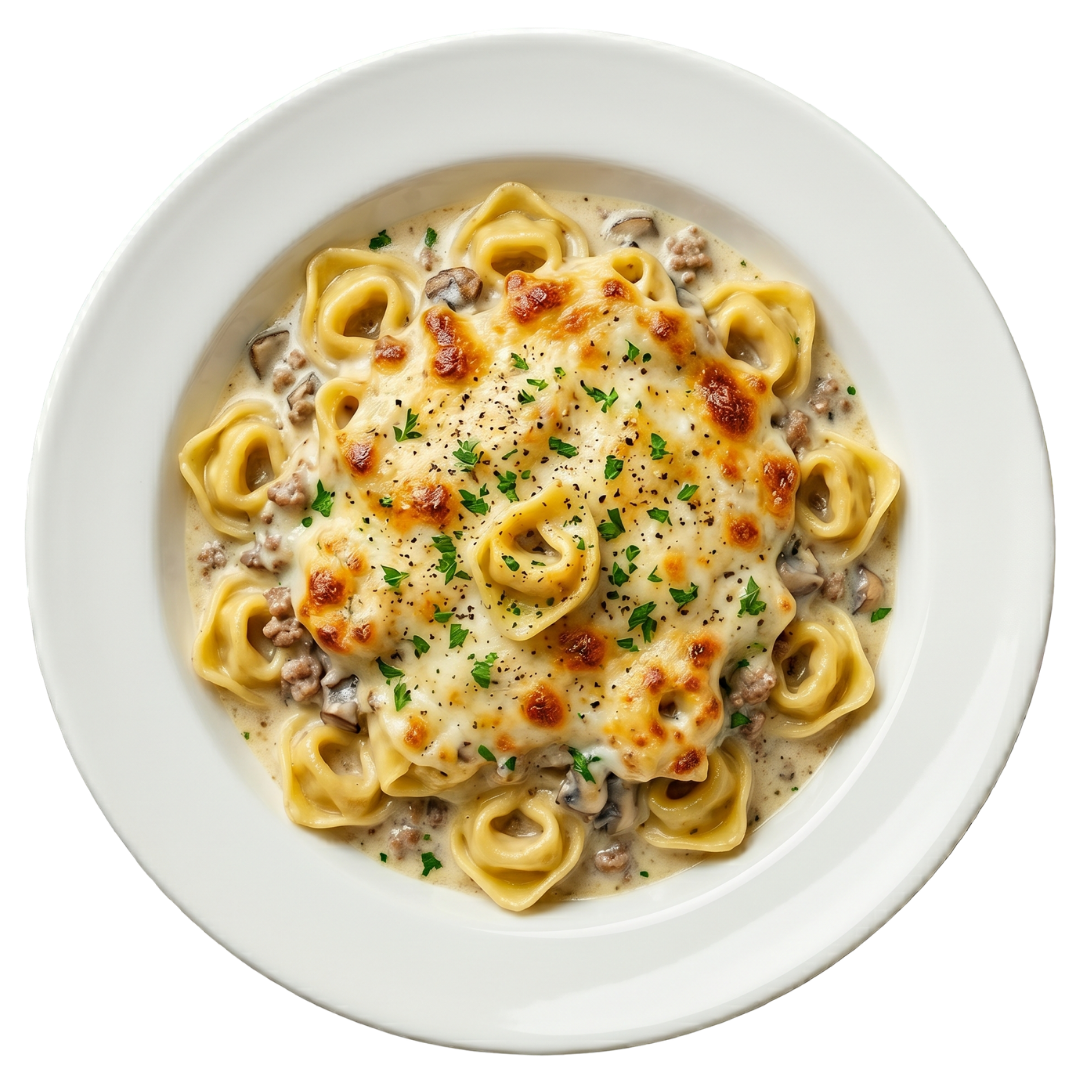 Unsere Tortellini al Forno bestehen aus gefüllten Nudeln mit einer herzhaften Mischung aus Pilzen und Hackfleisch. Die Füllung wird sorgfältig gewürzt, damit Textur und Aroma ausgeglichen sind. Wahlweise bieten wir die Tortellini auch in glutenfreier Ausführung oder mit Vollkorn- bzw. glutenfreiem Nudelteig an. Die Nudelauswahl umfasst Alternativen wie Penne, Spaghetti, Ravioli Ricotta e Spinaci, Gnocchi, Rigatoni, Tagliatelle und selbstverständlich Tortellini. So können Gäste das Gericht genau nach Vorliebe anpassen – dieselbe cremige Bechamelsauce und die überbackene Käsekruste bleiben erhalten. Das Gericht wird mit einer samtigen Hack‑Bechamelsauce verbunden und im Ofen überbacken, bis der Käse goldbraun ist.