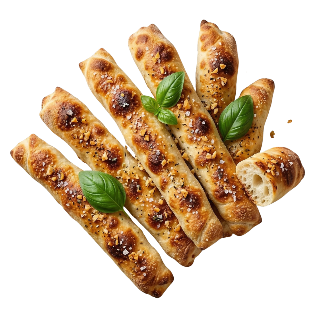 Unsere Trombini verbinden knusprige Textur mit intensivem Aroma: frisch gebackene Pizza-Stangen, goldbraun im Ofen, fein mit Meersalz bestreut und mit duftendem Knoblauch veredelt. Außen kross, innen weich – ideal zum Teilen oder als Begleitung zu Salaten und Antipasti.